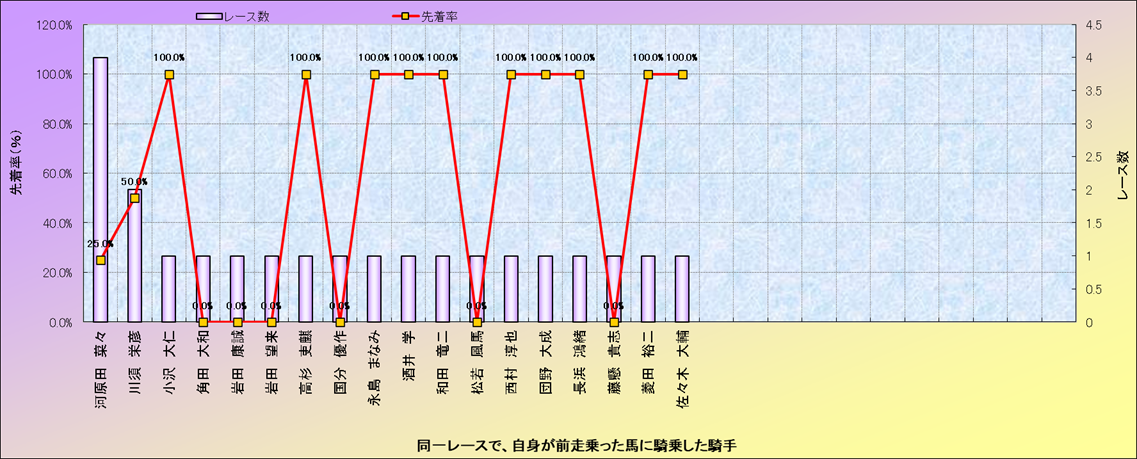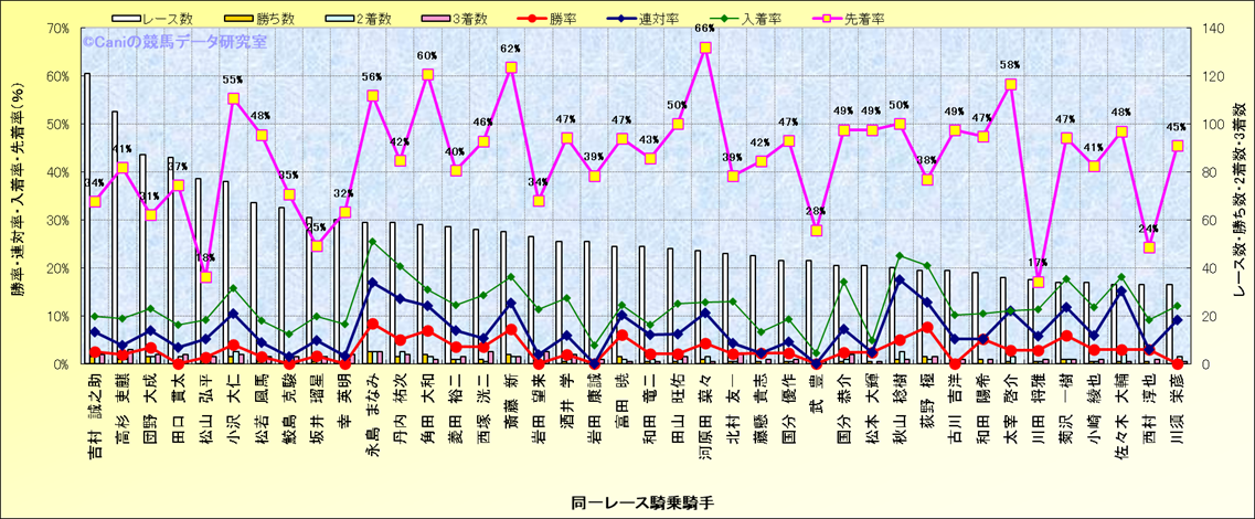 ライバル(相性)解析。 同一レースに下記騎手が騎乗した場合の成績と、その騎手に先着する先着率(近1年) |