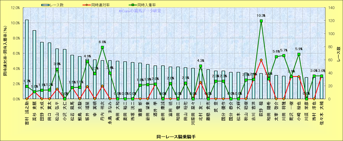 ライバル(相性)解析。 同一レースに下記騎手が騎乗した場合の同時に連対する率と同時に入着する率(近1年) |