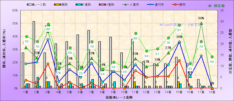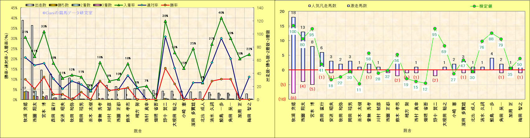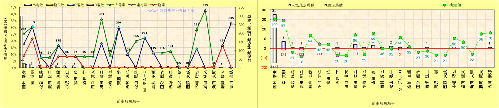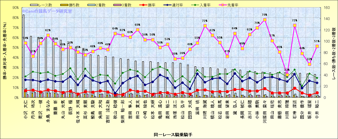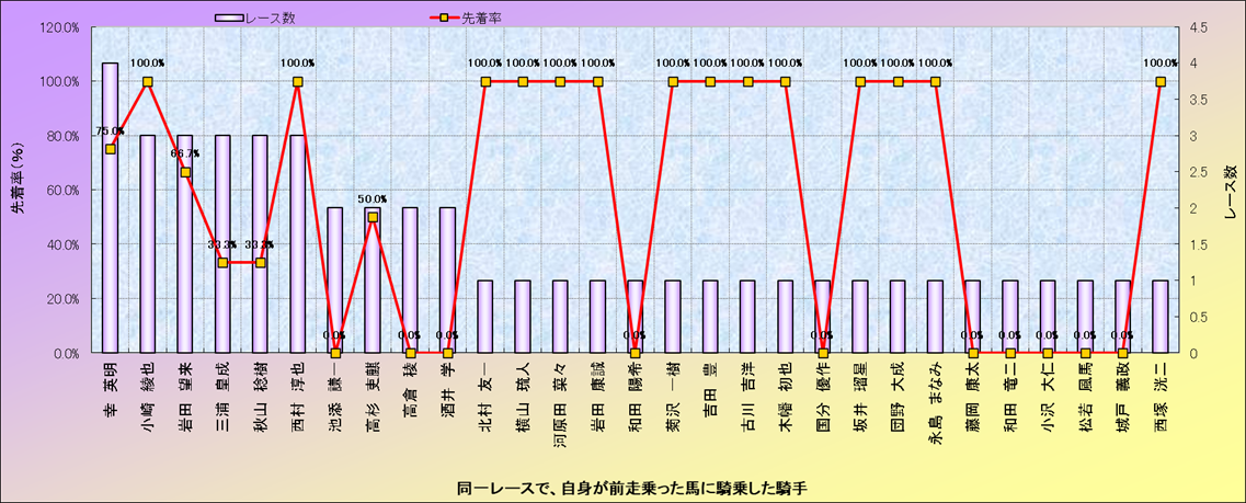 ライバル(相性)解析。 同一レースに下記騎手が騎乗した場合の成績と、その騎手に先着する先着率(近1年) |