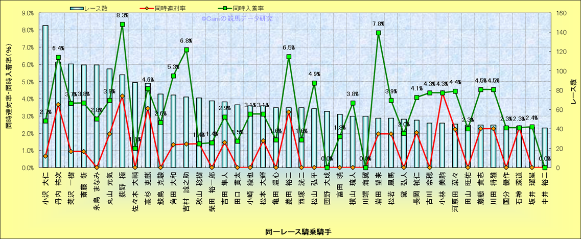 ライバル(相性)解析。 同一レースに下記騎手が騎乗した場合の同時に連対する率と同時に入着する率(近1年) |