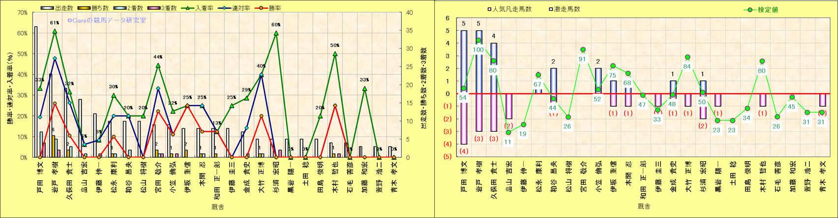 ライバル(相性)解析。 同一レースに下記騎手が騎乗した場合の同時に連対する率と同時に入着する率(近1年) |