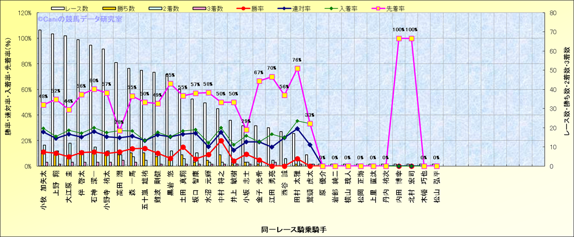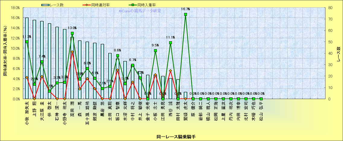 ライバル(相性)解析。 同一レースに下記騎手が騎乗した場合の成績と、その騎手に先着する先着率(近1年) |