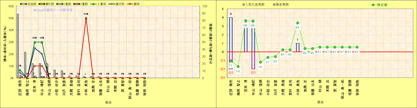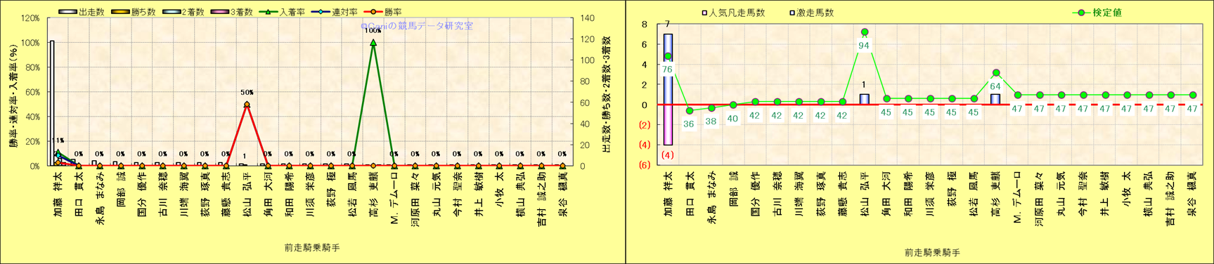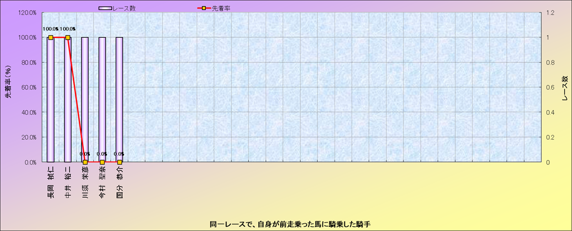 ライバル(相性)解析。 同一レースに下記騎手が騎乗した場合の成績と、その騎手に先着する先着率(近1年) |