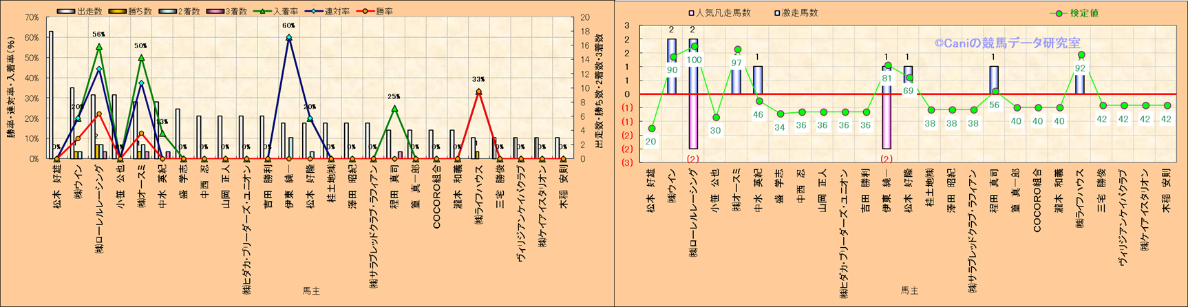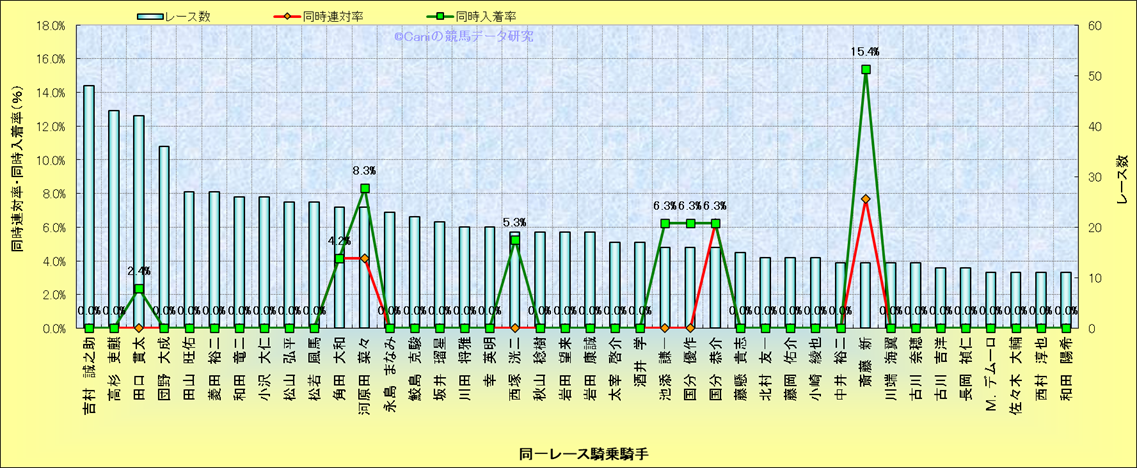 ライバル(相性)解析。 同一レースに下記騎手が騎乗した場合の同時に連対する率と同時に入着する率(近1年) |