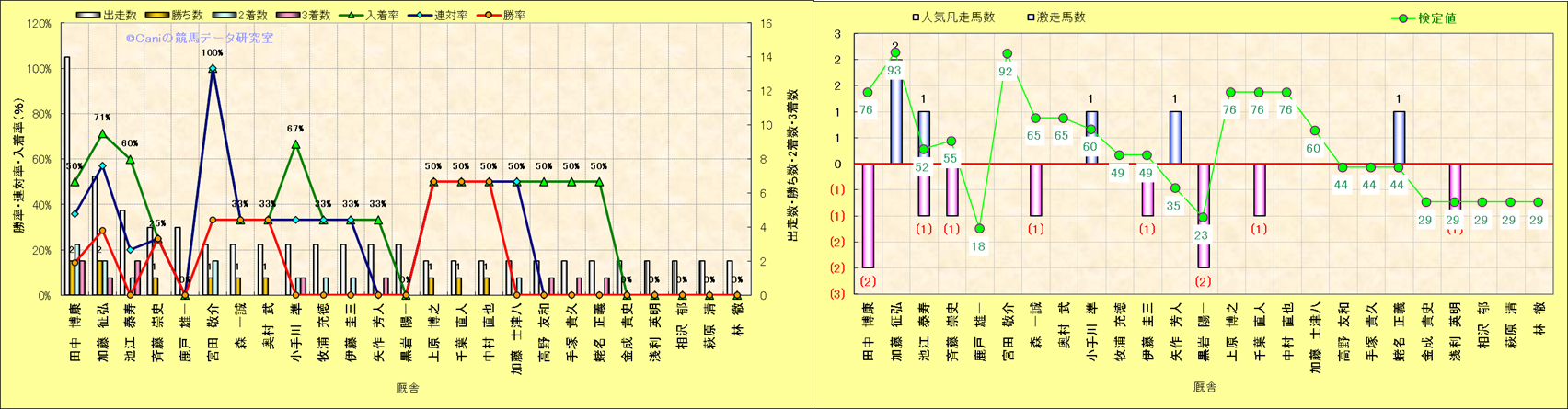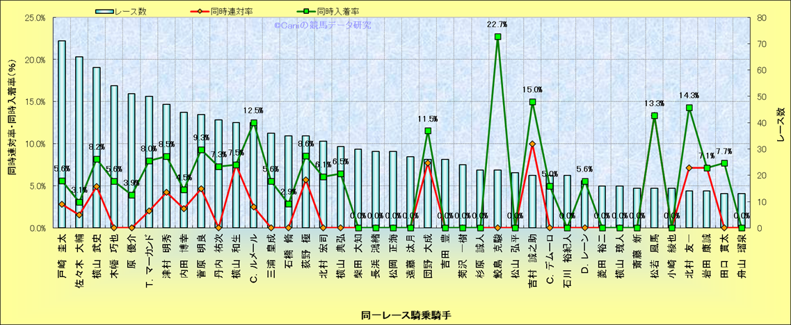 ライバル(相性)解析。 同一レースに下記騎手が騎乗した場合の同時に連対する率と同時に入着する率(近1年) |