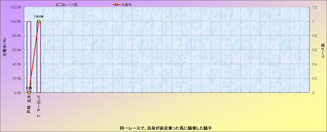 ライバル(相性)解析。 同一レースに下記騎手が騎乗した場合の成績と、その騎手に先着する先着率(近1年) |