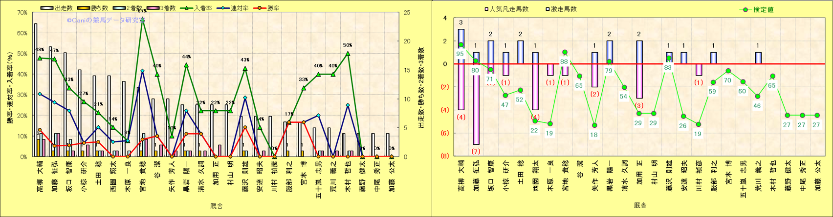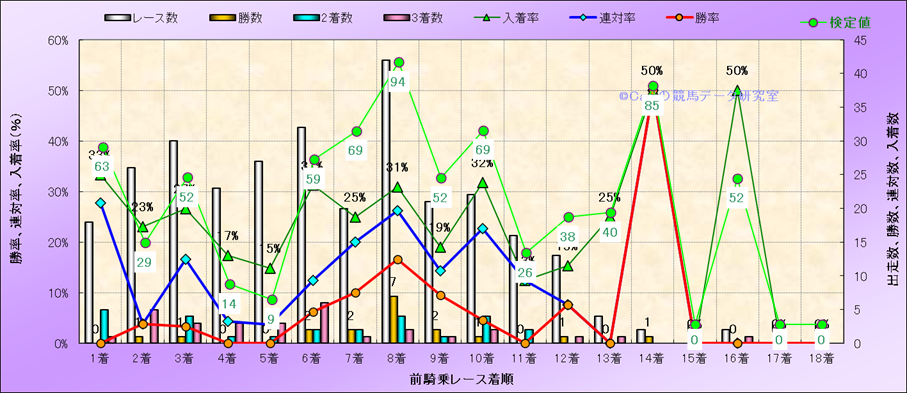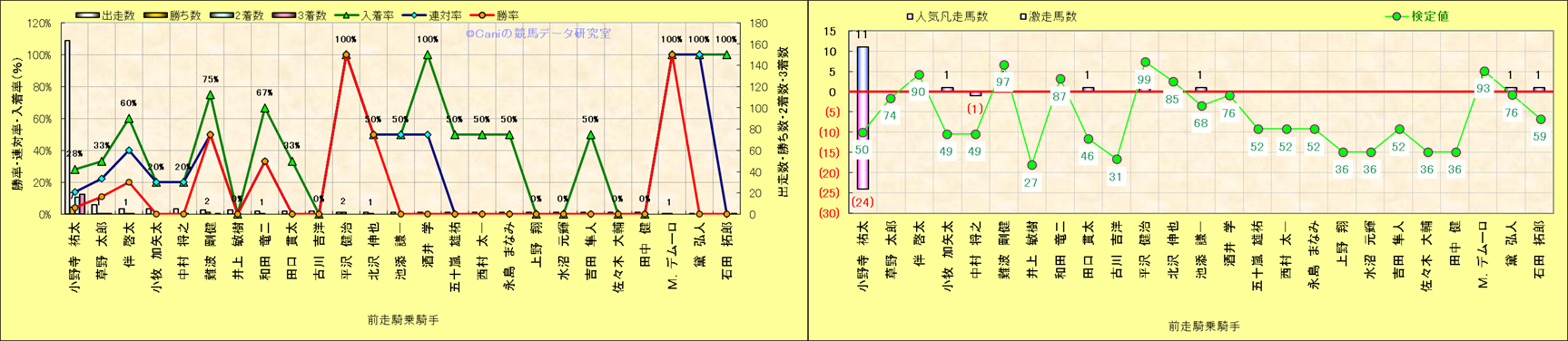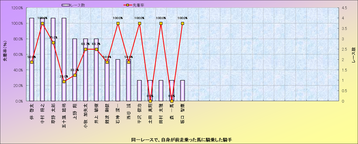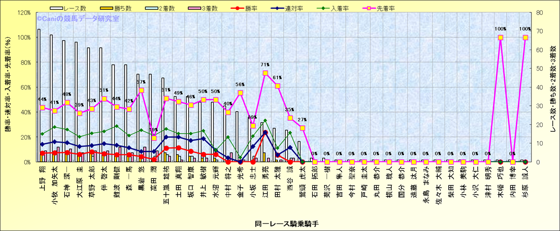 ライバル(相性)解析。 同一レースに下記騎手が騎乗した場合の成績と、その騎手に先着する先着率(近1年) |