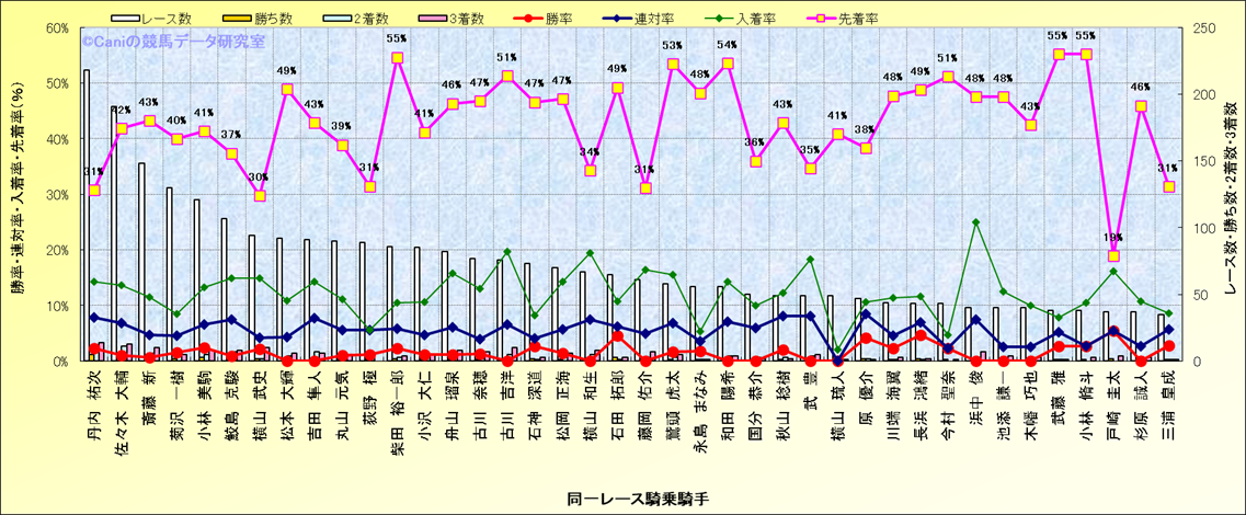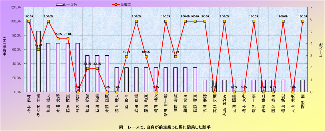 ライバル(相性)解析。 同一レースに下記騎手が騎乗した場合の成績と、その騎手に先着する先着率(近1年) |