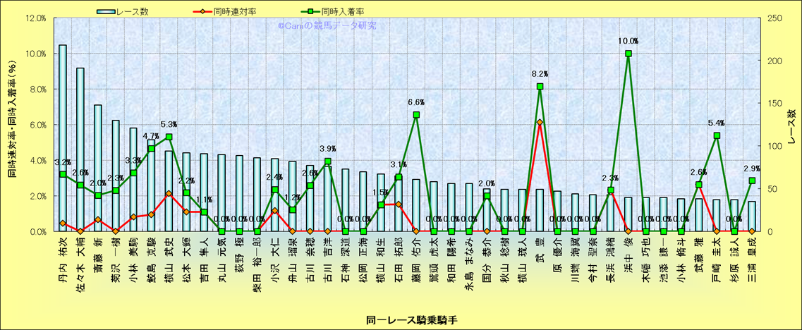 ライバル(相性)解析。 同一レースに下記騎手が騎乗した場合の同時に連対する率と同時に入着する率(近1年) |