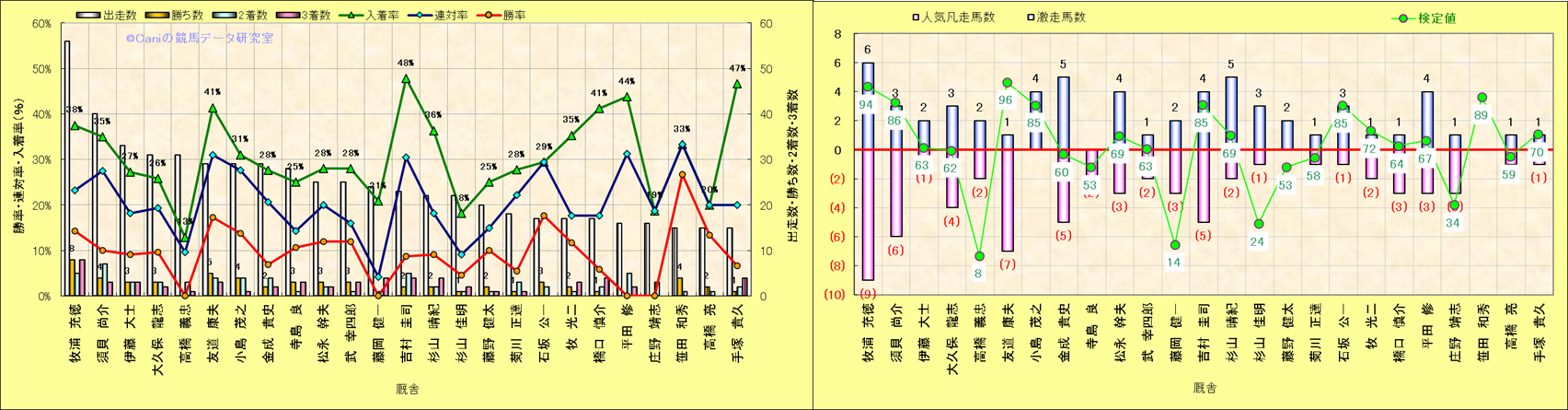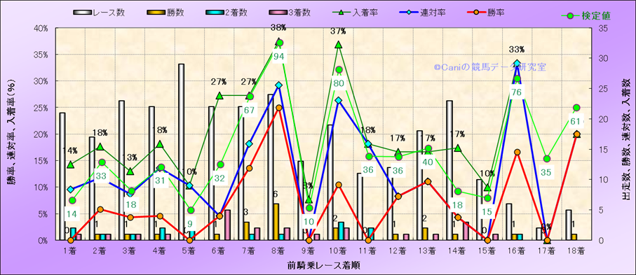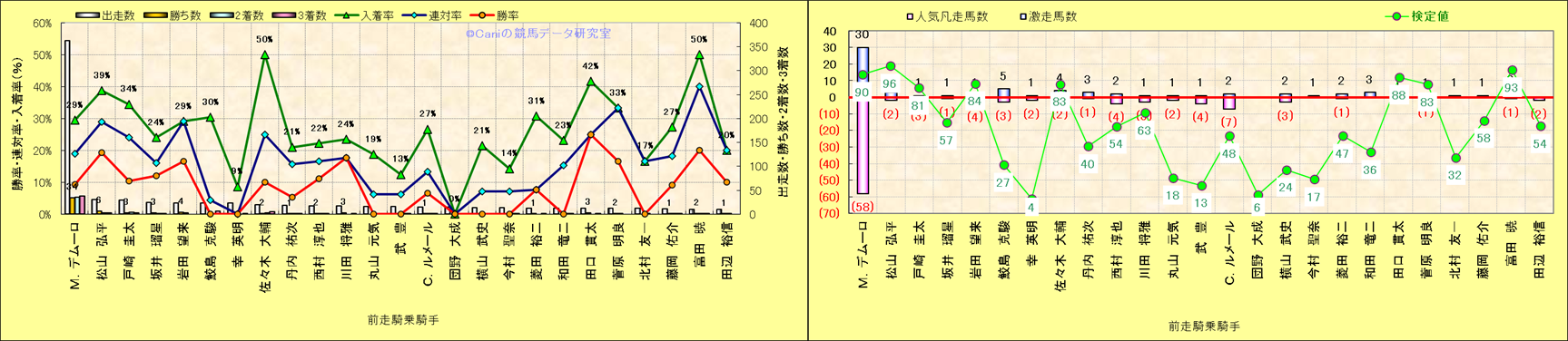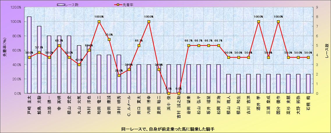 ライバル(相性)解析。 同一レースに下記騎手が騎乗した場合の成績と、その騎手に先着する先着率(近1年) |