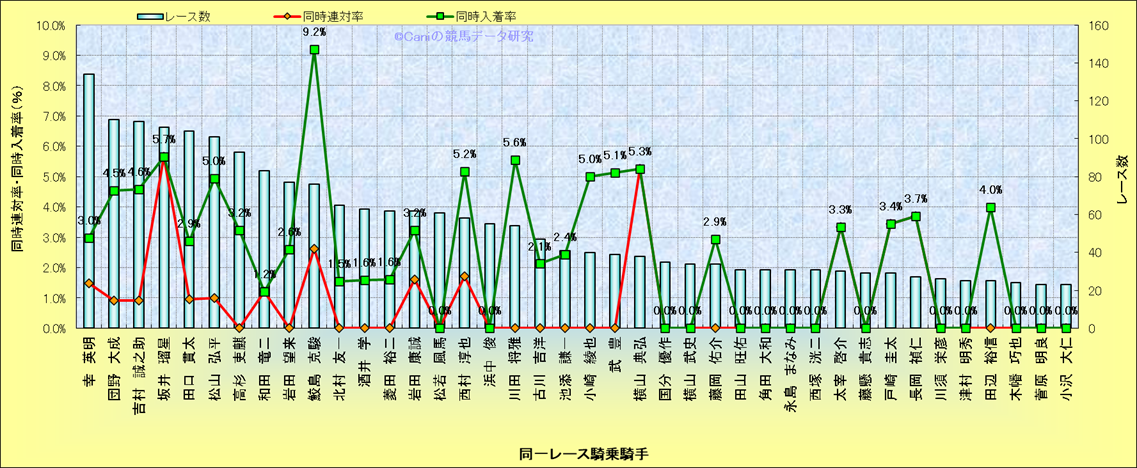 ライバル(相性)解析。 同一レースに下記騎手が騎乗した場合の同時に連対する率と同時に入着する率(近1年) |
