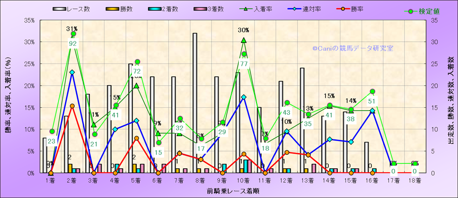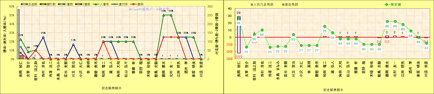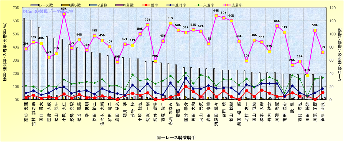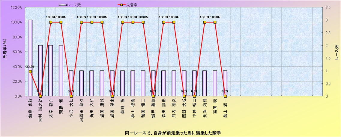 ライバル(相性)解析。 同一レースに下記騎手が騎乗した場合の成績と、その騎手に先着する先着率(近1年) |