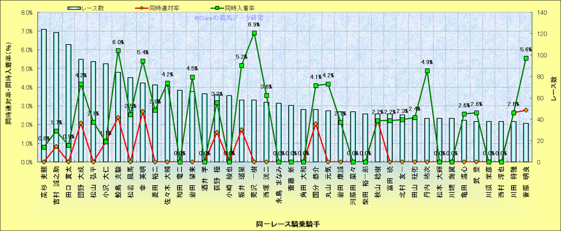 ライバル(相性)解析。 同一レースに下記騎手が騎乗した場合の同時に連対する率と同時に入着する率(近1年) |