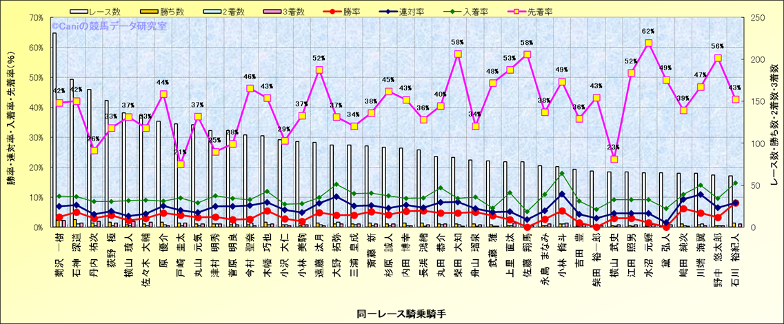 ライバル(相性)解析。 同一レースに下記騎手が騎乗した場合の成績と、その騎手に先着する先着率(近1年) |