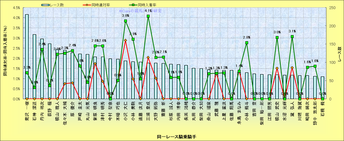 ライバル(相性)解析。 同一レースに下記騎手が騎乗した場合の同時に連対する率と同時に入着する率(近1年) |