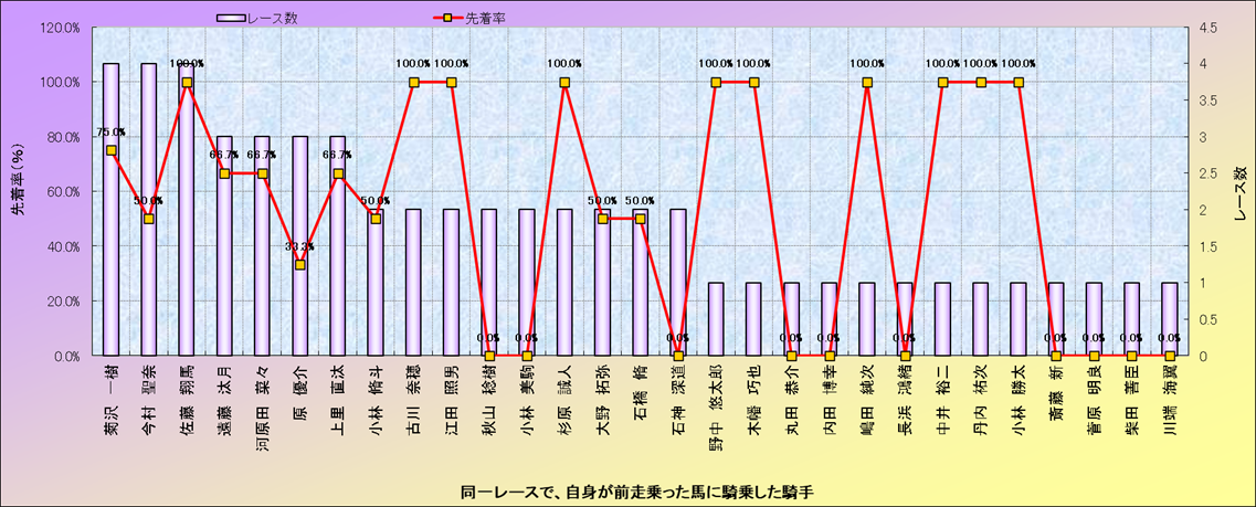 同一レースで、前走騎乗馬と競った場合の、その馬に対する先着率(乗り替わり騎手別、近3年) |