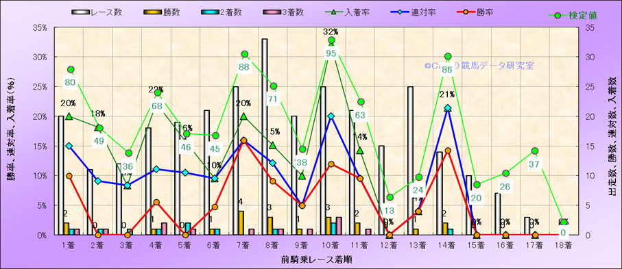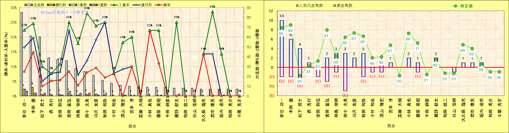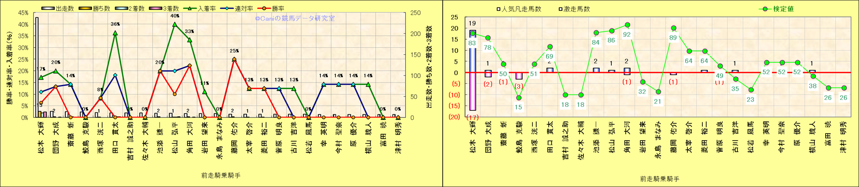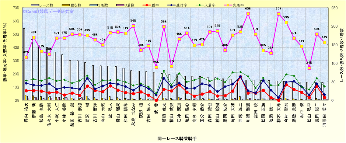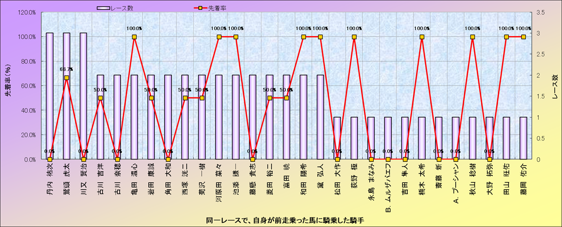 ライバル(相性)解析。 同一レースに下記騎手が騎乗した場合の成績と、その騎手に先着する先着率(近1年) |