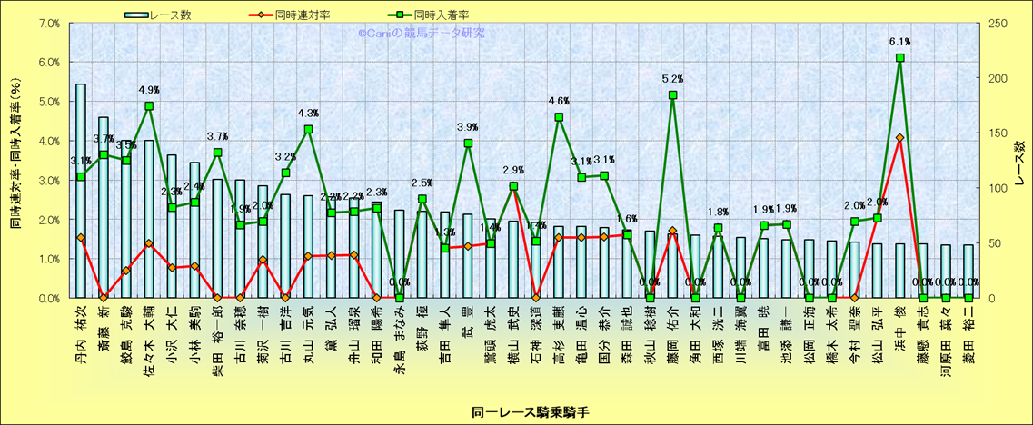 ライバル(相性)解析。 同一レースに下記騎手が騎乗した場合の同時に連対する率と同時に入着する率(近1年) |