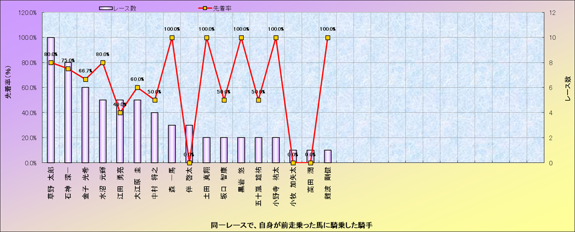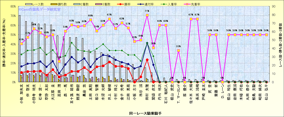ライバル(相性)解析。 同一レースに下記騎手が騎乗した場合の成績と、その騎手に先着する先着率(近1年) |