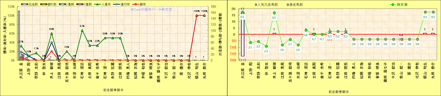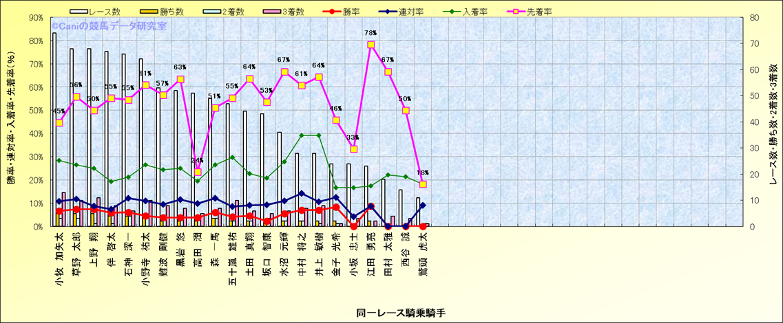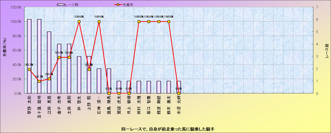 ライバル(相性)解析。 同一レースに下記騎手が騎乗した場合の成績と、その騎手に先着する先着率(近1年) |