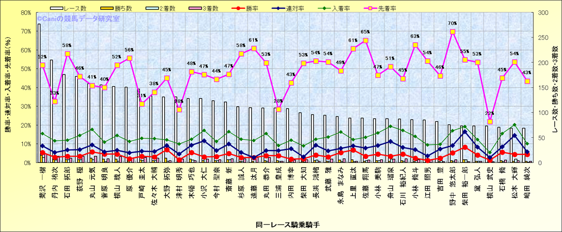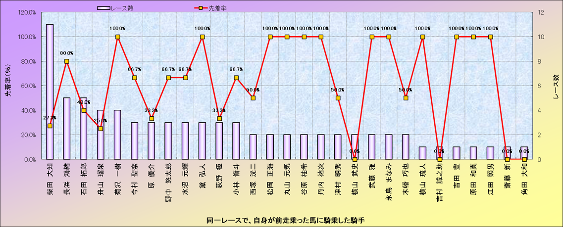 ライバル(相性)解析。 同一レースに下記騎手が騎乗した場合の成績と、その騎手に先着する先着率(近1年) |
