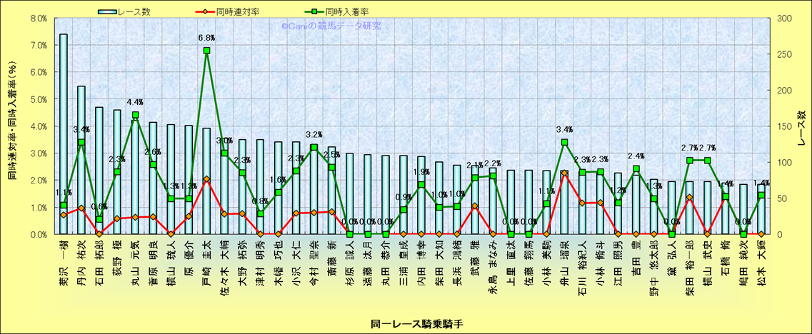 ライバル(相性)解析。 同一レースに下記騎手が騎乗した場合の同時に連対する率と同時に入着する率(近1年) |