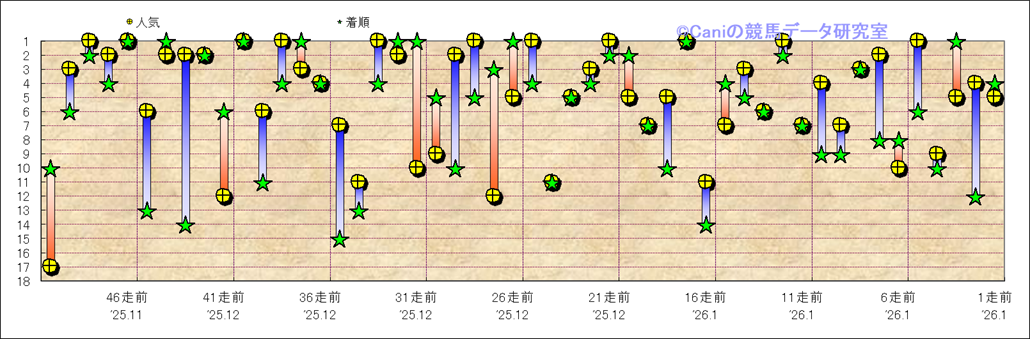 所属馬 近50レースの人気と着順 |