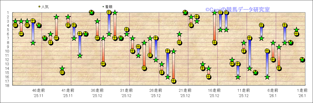 所属馬 近50レースの人気と着順 |