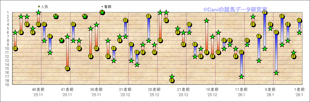 所属馬 近50レースの人気と着順 |