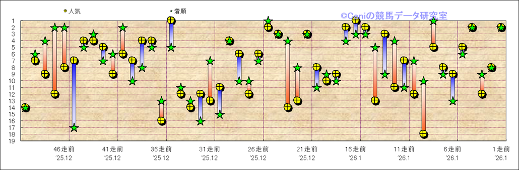 所属馬 近50レースの人気と着順 |