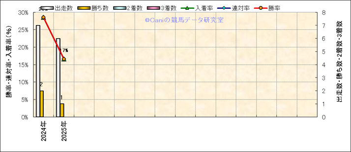 | 2025/8/30 | 中京 | 10 | 芝 | 1400 | 1000万 | 桑名特別 | 11 | 6 | 6 | 1 | 高杉 吏麒 | 56 | 1分20秒4 | 0.1 | 35.1 | 33.6 | 最内 (7) | 1 | 晴 | 良 | 474 | 13.1 | 1310 | 410 | ||