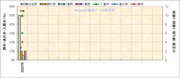| 2025/4/5 | 阪神 | 1 | ダート | 1800 | 未勝利 | 16 | 1 | 4 | 10 | 川又 賢治 | 55 | 1分57秒2 | 1.7 | 39.2 | 39.8 | 最内 (12) | 3 | 晴 | 良 | 534 | 15.4 | 0 | 0 | |||