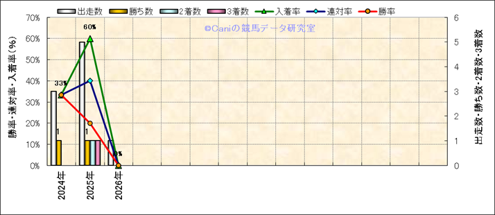 | 2026/1/11 | 中山 | 12 | ダート | 1200 | 1000万 | 16 | 1 | 5 | 15 | 三浦 皇成 | 58 | 1分14秒1 | 3.2 | 34.3 | 39.8 | 最内 (15) | 9 | 晴 | 良 | 468 | 7.3 | 0 | 0 | |||
