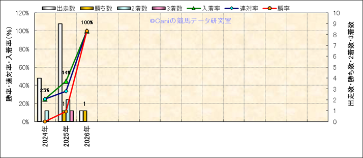 | 2026/1/5 | 中山 | 4 | ダート | 2400 | 500万 | 13 | 11 | 1 | 1 | 丹内 祐次 | 57 | 2分37秒0 | 0.5 | 38.7 | 40.1 | 中 (1) | 2 | 晴 | 稍重 | 502 | 1.5 | 150 | 110 | |||