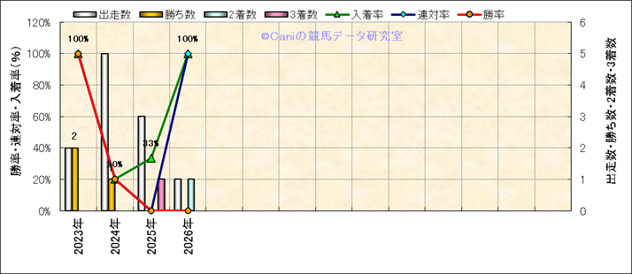 | 2026/1/12 | 中山 | 11 | 芝 | 1600 | オープン | ニューイヤーステ | 14 | 1 | 2 | 2 | 津村 明秀 | 57 | 1分32秒2 | 0 | 35.4 | 34 | 内 (5) | 42 | 晴 | 良 | 508 | 3.6 | 0 | 150 | ||