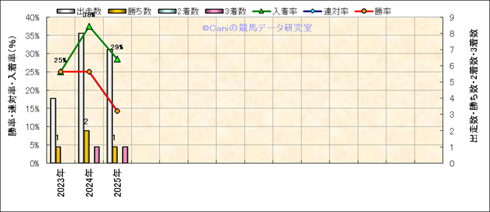 | 2025/7/26 | 新潟 | 7 | 芝 | 1400 | 1600万 | 新潟日報賞 | 10 | 10 | 9 | 3 | 内田 博幸 | 58 | 1分19秒9 | 0.8 | 35.2 | 33.3 | 内 (3) | 5 | 晴 | 良 | 462 | 46.8 | 0 | 520 | ||