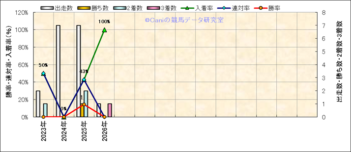 | 2025/7/20 | 福島 | 1 | 芝 | 2770 | 未勝利 | 14 | 11 | 1 | 2 | 五十嵐 雄祐 | 60 | 3分06秒5 | 0.1 | 41.2 | 最内 (5) | 1 | 晴 | 良 | 460 | 3.7 | 0 | 150 | ||||