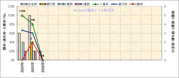 | 2026/1/12 | 京都 | 9 | 芝 | 2400 | 1000万 | 琵琶湖特別 | 12 | 6 | 5 | 8 | 団野 大成 | 55 | 2分25秒6 | 0.9 | 35.3 | 35.9 | 内 (9) | 2 | 晴 | 良 | 464 | 13.2 | 0 | 0 | ||