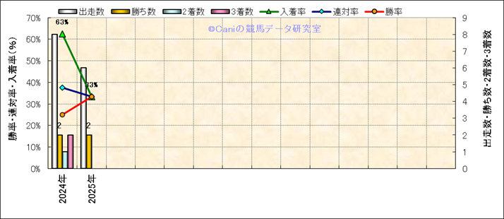 | 2025/1/11 | 中京 | 9 | 芝 | 2000 | 1000万 | 渥美特別 | 13 | 10 | 1 | 4 | 松山 弘平 | 55 | 2分02秒1 | 0.4 | 37.6 | 35.2 | 中 (3) | 5 | 晴 | 良 | 440 | 2.4 | 0 | 0 | ||