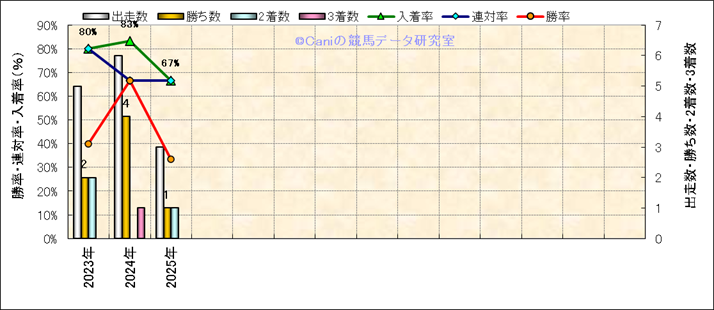| 2025/4/12 | 阪神 | 11 | 芝 | 1600 | オープン | 阪神牝馬ステーク | 14 | 1 | 3 | 2 | 幸 英明 | 55 | 1分32秒8 | 0 | 36 | 33 | 内 (3) | 6 | 曇 | 良 | 464 | 6.2 | 0 | 270 | ||