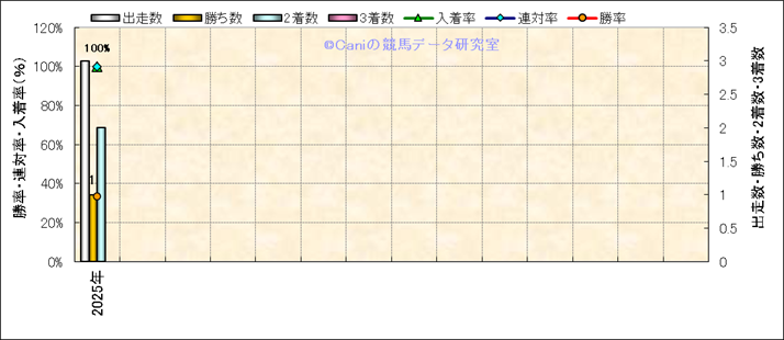 | 2025/9/7 | 中山 | 5 | 芝 | 1800 | 新馬 | 12 | 3 | 1 | 1 | 戸崎 圭太 | 55 | 1分48秒9 | 0 | 37.8 | 33.9 | 内 (2) | 5 | 晴 | 良 | 442 | 1.8 | 180 | 110 | |||