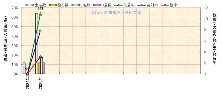 | 2025/8/10 | 札幌 | 12 | ダート | 1700 | 1000万 | Fビレッジ特別 | 14 | 11 | 3 | 3 | 丹内 祐次 | 54 | 1分45秒2 | 1.3 | 36.4 | 38.4 | 中 (8) | 3 | 曇 | 良 | 514 | 10.7 | 0 | 200 | ||