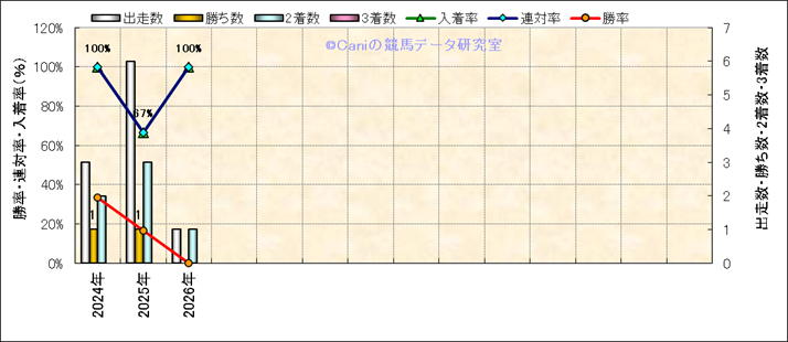| 2026/1/10 | 中山 | 10 | 芝 | 1600 | 1000万 | 初凪賞 | 16 | 8 | 2 | 2 | 佐々木 大輔 | 57 | 1分33秒9 | 0.1 | 35.8 | 34.3 | 外 (3) | 5 | 晴 | 良 | 484 | 4.4 | 0 | 170 | ||