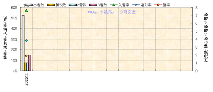 | 2025/8/23 | 札幌 | 9 | 芝 | 1500 | オープン | クローバー賞 | 9 | 6 | 4 | 1 | A.バデル | 55 | 1分29秒7 | 0.6 | 36.4 | 36 | 大外 (1) | 5 | 晴 | 良 | 454 | 6.6 | 660 | 210 | ||