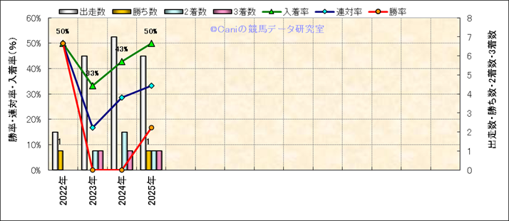 | 2025/3/16 | 阪神 | 9 | 芝 | 1600 | 1000万 | 皆生特別 | 9 | 5 | 2 | 5 | 鮫島 克駿 | 58 | 1分34秒9 | 0.6 | 37 | 35 | 最内 (1) | 8 | 雨 | 重 | 450 | 4.3 | 0 | 0 | ||