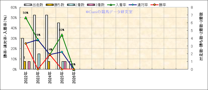 | 2026/1/5 | 京都 | 11 | 芝 | 3000 | オープン | 万葉ステークス | 9 | 1 | 6 | 9 | 藤懸 貴志 | 49 | 3分10秒5 | 3 | 40 | 36.2 | 最内 (9) | 7 | 晴 | 良 | 546 | 15.5 | 0 | 0 | ||