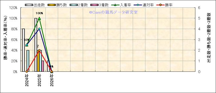 | 2026/1/5 | 中山 | 9 | ダート | 1800 | 1000万 | 初茜賞 | 12 | 5 | 1 | 10 | 横山 和生 | 57 | 1分54秒9 | 2.2 | 37.6 | 40.6 | 最内 (11) | 2 | 晴 | 稍重 | 494 | 2.3 | 0 | 0 | ||