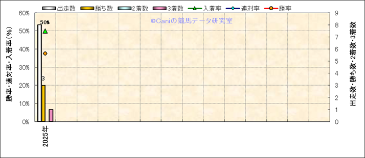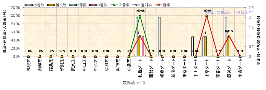 | 2025/8/24 | 札幌 | 10 | ダート | 1700 | 1000万 | ワールドASJ第 | 14 | 10 | 1 | 1 | T.ハマーハンセン | 54 | 1分45秒5 | 0.5 | 37.8 | 37.3 | 最内 (2) | 1 | 晴 | 良 | 486 | 3.7 | 370 | 160 | ||