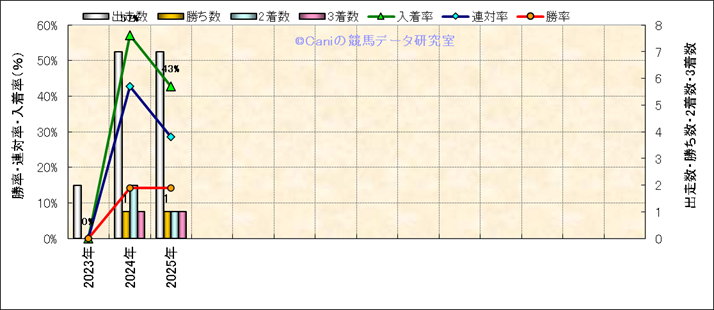 | 2025/10/19 | 京都 | 12 | ダート | 1800 | 1000万 | 聚楽第特別 | 14 | 12 | 3 | 5 | 川田 将雅 | 58 | 1分51秒7 | 0.8 | 36.8 | 37.3 | 外 (6) | 47 | 曇 | 良 | 508 | 6.3 | 0 | 0 | ||