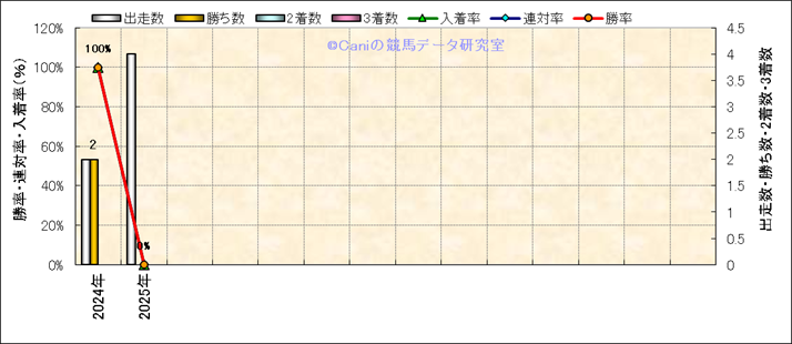 | 2025/8/30 | 札幌 | 11 | 芝 | 2000 | 1000万 | 札幌日刊スポーツ | 14 | 14 | 4 | 5 | 横山 武史 | 55 | 2分04秒5 | 1 | 37.5 | 37.5 | 内 (9) | 2 | 曇 | 稍重 | 514 | 6.6 | 0 | 0 | ||